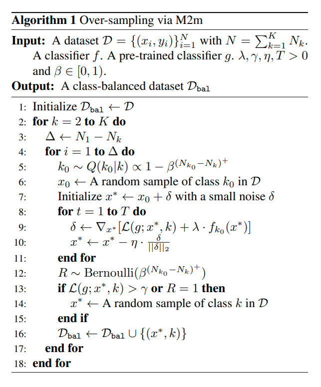 M2m method의 경우, 이를 행하기 위해 sythetic sample을 majority class로 부터 생성하여 minority sample에 추가한다.