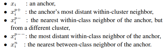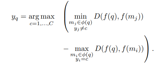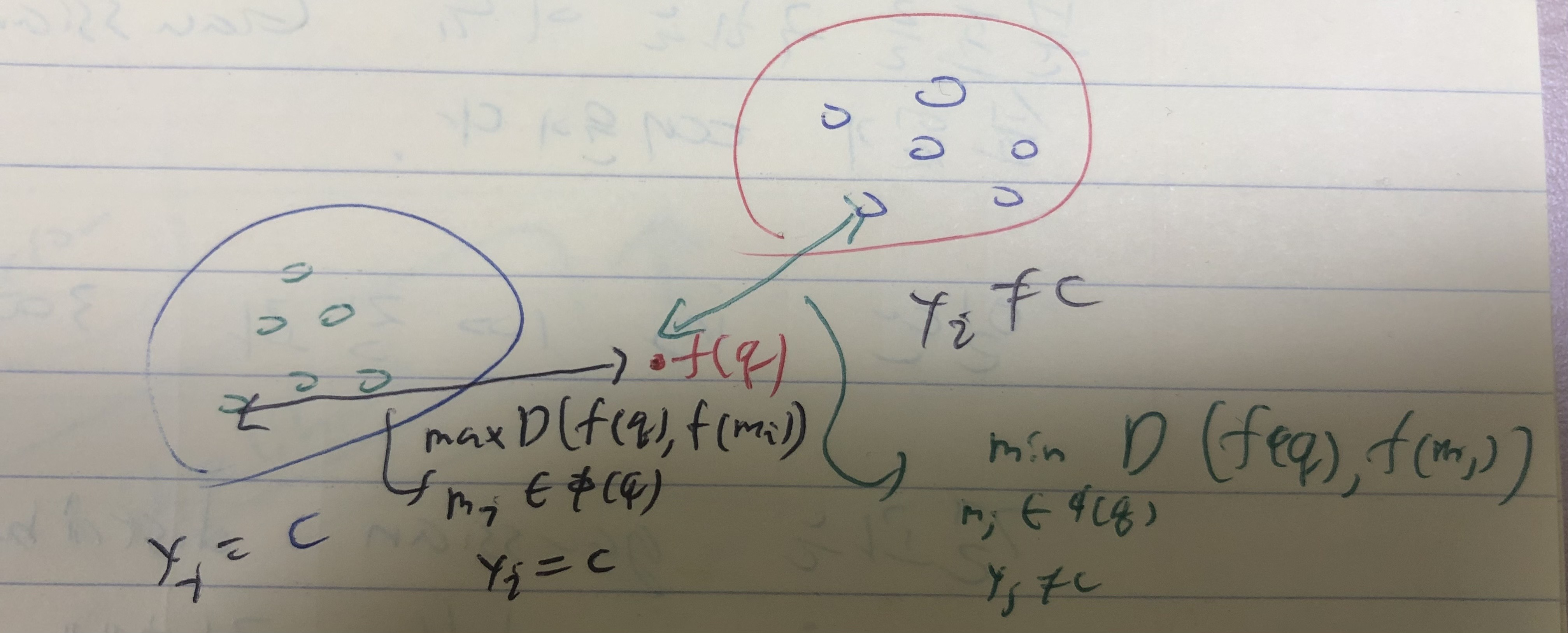 요약하자면 assumtion 하는 class에 해당하는 가장 멀리있는 cluster와의 거리와 해당 class를 제외한 나머지 class의 cluster중에서 가장 가까운 거리를 계산해 차이를 구한다. 이때, 위 식의 값이 크다는 말은, 특정 class에 해당하는 cluster와를 max값을 취했는데도 작다. 즉, 가깝다는 의미이고, 특정 class를 제외한 class들과의 거리 중에서 가장 작은 값을 취했는데도 크다. 즉, 다른 class들과는 멀다는 의미이므로, 특정 class에 query가 가장 가깝다고 할 수 있다.