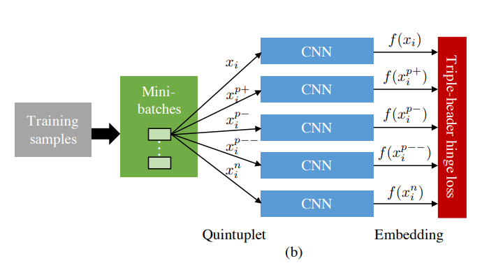 1) Triplet loss는 단순히 같은 class끼리는 당기고 다른 class는 떨어트리는 방식을 사용한다. 그러나 quintuplet은 class간과 class 내부의 instance level까지 같이 고려하기 때문에 더 rich한 feature를 추출할 수 있다는 장점이 있다.