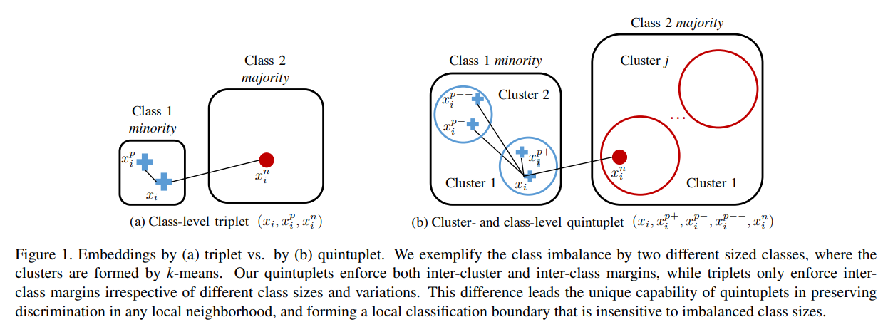 이에 반해 Quintuplet의 경우, class 내부에 또 다른 cluster를 형성하며, 이는 class 내부에서 생기는 variance를 표현할 수 있다. 이를 통해서 좀 더 넓은 class의 margin 및 boundary를 형성할 수 있고. imbalance에서 생기는 적절한 boundary를 형성하는 문제에서 도움이 될 수 있다.