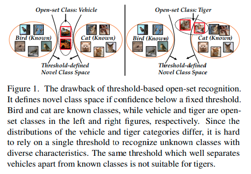 그러나 이러한 방법의 경우 위 그림 왼쪽과 같이 기존 클래스와 확연히 다른 경우 logit or softmax 값이 낮게 나와 openset 분류가 가능하지만, 위 그림 오른쪽과 같이 기존 클래스와 비슷한 클래스의 경우 기존 thresholding 방법으로는 구분이 어렵다.
