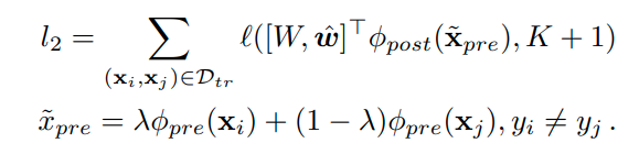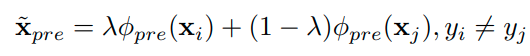 이때 manifold mixup를 pre-layer를 통과한 middle-level feature를 통해서 수행하며 수식으로 표현하면 다음과 같다.