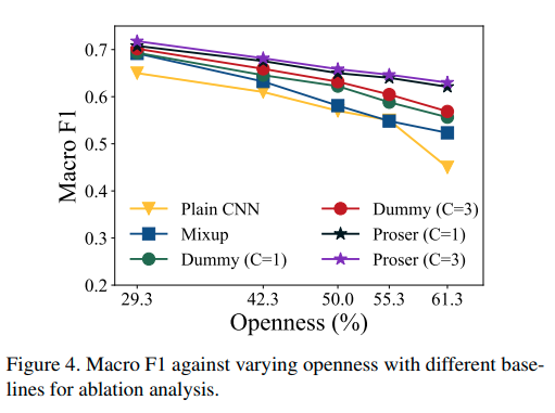 본 논문에서는 Cifar100 dataset에서 ablation study를 수행했으며, 100개의 Class 중에서 15개의 class는 known, unknown class는 다음과 같이 조절하면서 실험하였다. (randomly selected) 이에 따른 openness는 29.29% ~ 61.28%로 변한다.