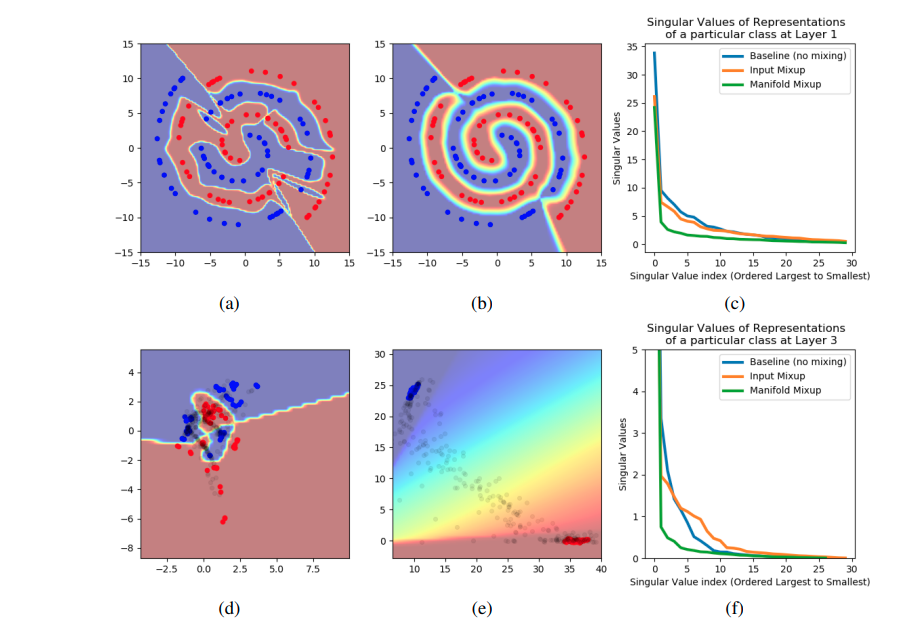 - (b)는 manifold mixup를 적용한 딥러닝 네트워크의 decision boundary를 보여주고 있다. (smoothing 되었음)
