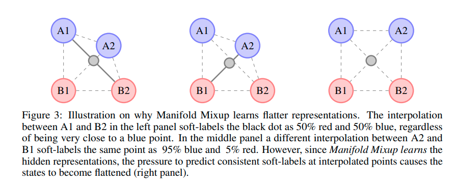 저자는 왜 Manifold-Mixup이 feature representation을 flatten하는 효과를 가져오는지 설명한다.
