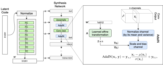 각 레이어마다 다른 A FC가 있기 때문에 각각 다른 평균, 분산 값을 아웃풋으로 내어주게 되고, 이는 레이어마다 다른 스타일을 생성한다는 것을 의미한다. (레이어마다 생성하는 attribute를 disentanglement가능함.)