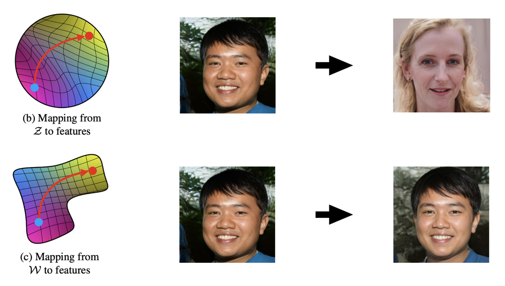 GAN의 latent space인 z space의 경우 위와 같이 각 attribute에 해당하는 요소들이 entangle되어 있기 때문에 latent space walking을 통해서 각 attribute를 변화시키는 것이 어렵다.