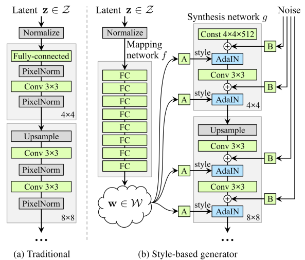 따라서 PGGAN과 같은 GAN모델에서도 style을 변화시키고 싶지만, 이미지 생성을 담당하는 latent vector의 latent space가 entangle되어 이와 같은 작업이 어렵다는 점을 해결하고 싶었고, 먼저 mapping network를 활용하여 기존의 z를 attribute들을 disentanglement 할 수 있는 W공간으로 mapping 시키는 mapping network를 도입한다.