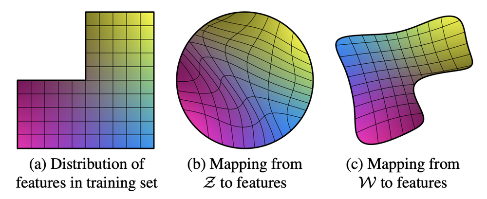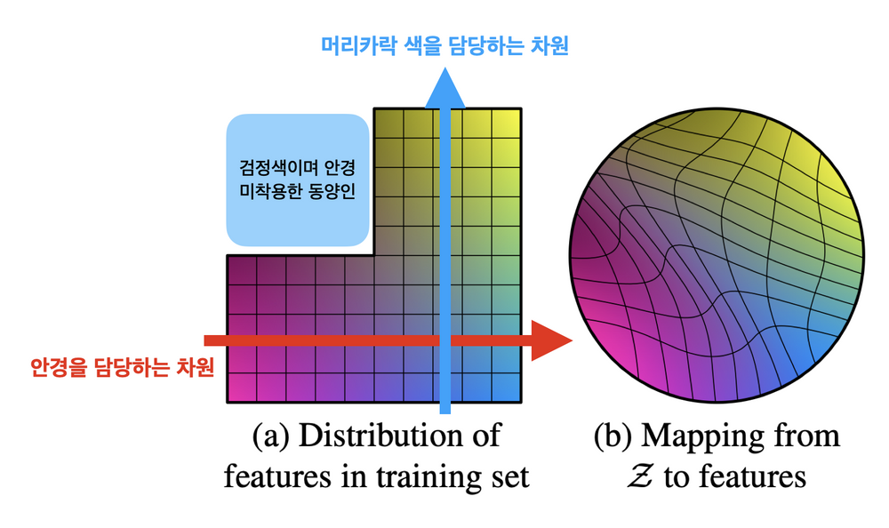 GAN의 latent space인 z space의 경우 위와 같이 각 attribute에 해당하는 요소들이 entangle되어 있기 때문에 latent space walking을 통해서 각 attribute를 변화시키는 것이 어렵다.