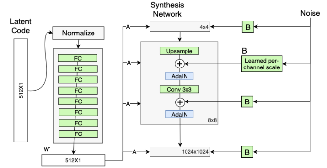 따라서 PGGAN과 같은 GAN모델에서도 style을 변화시키고 싶지만, 이미지 생성을 담당하는 latent vector의 latent space가 entangle되어 이와 같은 작업이 어렵다는 점을 해결하고 싶었고, 먼저 mapping network를 활용하여 기존의 z를 attribute들을 disentanglement 할 수 있는 W공간으로 mapping 시키는 mapping network를 도입한다.