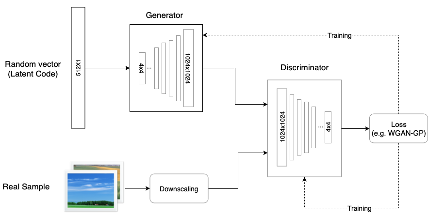 ProGAN의 경우, GAN과의 구조가 유사하나, high resolution image를 바로 high resolution으로 생성하는게 아니라, low resolution부터 생성하는 방법을 통해 고화질 이미지를 생성한다.