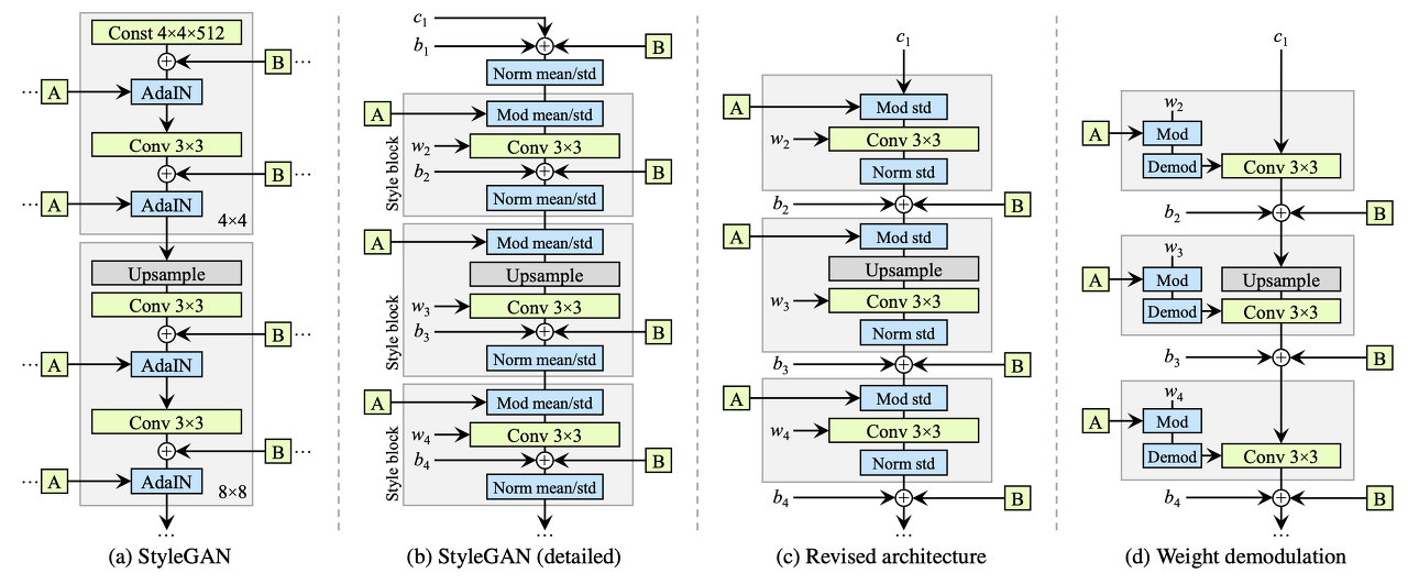 먼저 AdaIN 때문에 발생하는 droplet artifact를 해결하기 위해, AdaIn 대신 Weight Demodulation을 도입한다.
