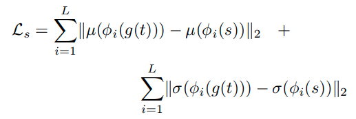 ϕi.는 VGG-19의 i번째 레이어이다. 스타일로스에서 사용한 레이어는 relu1 1, relu2 1, relu3 1, relu4 1 이다. 이 역시 간단하게 설명하자면, 원래 스타일 s를 인코더에 넣었을 때의 i번째 feature ϕi(s)의 평균과 t를 디코더에 넣고 이를 다시 encoder에 넣었을 때의 i번째 Feature ϕi(g(t)) 의 평균(μ)과 표준편차(σ)를 최소화 시키는 방법으로 스타일 로스를 구한것이다.