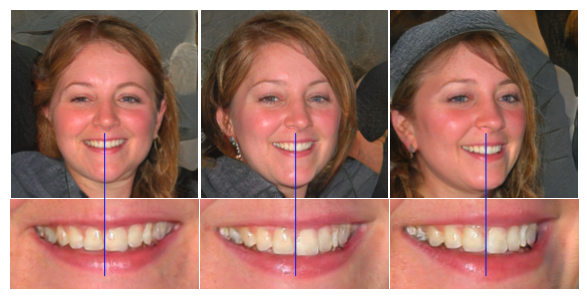 다음은 일부 feature가 얼굴의 움직임을 따르지 않는 문제이다. 아래 이미지를 보면 얼굴은 옆으로 변하지만 이의 배열은 얼굴을 따르지 않아서 부자연스럽다. 이 문제는 progressive growing으로 인해 발생한다고 한다.