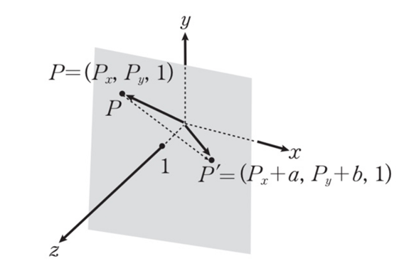 z의 값의 곱이 x,y에 더해지는데 z를 1정하면 우리가 이동하고 싶어하는 a,b가 그대로 유지되기 때문이다.