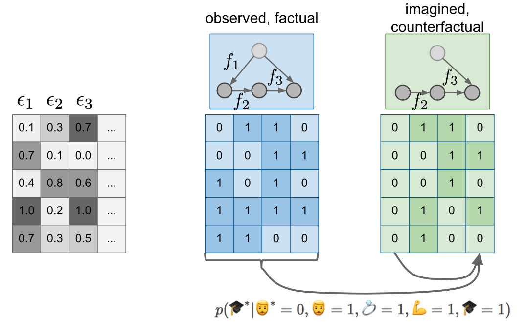 이렇게 입실론 변수가 각 사람별로 추가됨으로서, 사람별로 intervention이 적용되었을 때의 결과를 추론하는 확률 모델을 만들 수 있으며, 따라서 우리가 원했던 counterfactual에 대한 확률을 계산하는 모델을 만들 수 있게 된다.