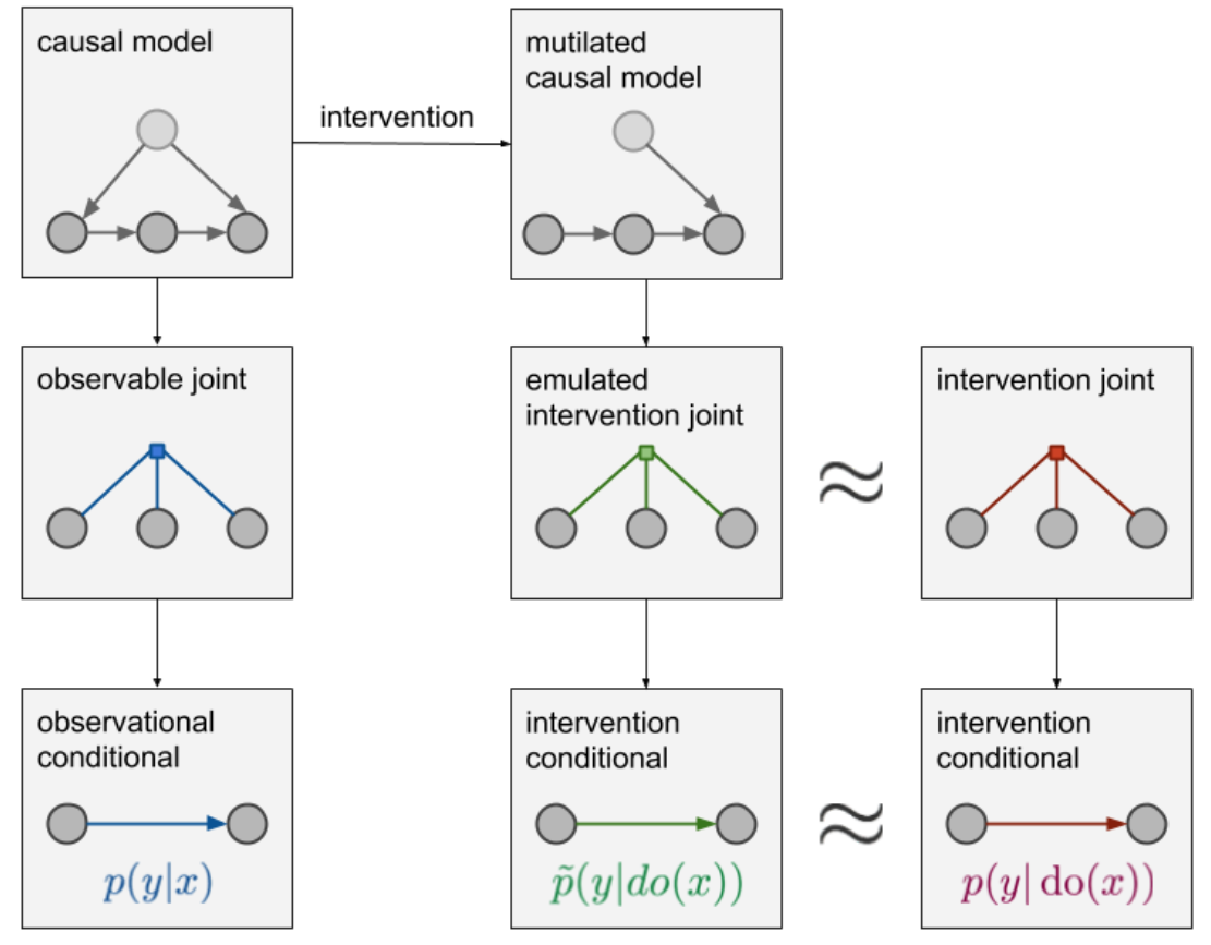 이렇게 causal 관계를 표현한식에서 intervention을 수행하는 것에 따라 우리는 기존의 causal model에서 mutilated를 수행할 수 있다. ( 기존 causal 관계도에서 화살표를 제거함) 이렇게 mutilated를 수행하여 우리가 원하는 x의 p(y|do(x)) 구하는 형태로 변형이 가능하다. (예시가 없어서 정확히는 이해 못했음) 이러한 과정을 거쳐서 원래의 intervention joint distribution을 근사한 emulated intervention joint distribution을 구할 수 있고, 따라서 p(y|do(x)) 또한 간접적으로 구할 수 있게 된다.