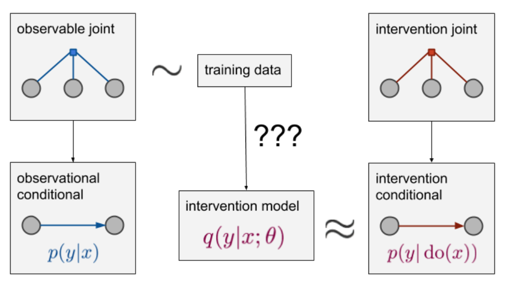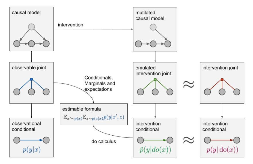 원래라면 오른쪽 그림처럼 intervention joint distributuion에서 sampling을 진행하여, 모델을 학습시키면 된다. 그러나 앞서 이야기 한 것처럼 직접적으로 intervention joint distribution에서 sampling하는것은 어렵거나 불가능할 수 있고, 때문에 observable joint distribution으로 부터 sampling하여 p(y|do(x))를 계산하여야 한다.