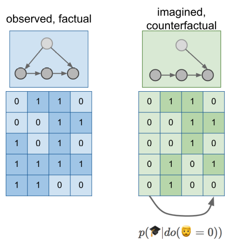 이렇게 causal diagram이 있으면 우리는 실제로는 불가능하지만 가상으로 distribution을 생성할 수 있다. 위의 예에서는 원래는 수염이 있는 사람들을 수염이 없는 상태로 가상으로 distribution을 만들어 내어서 p(🎓|do(🧔=0))를 계산하고 있다.