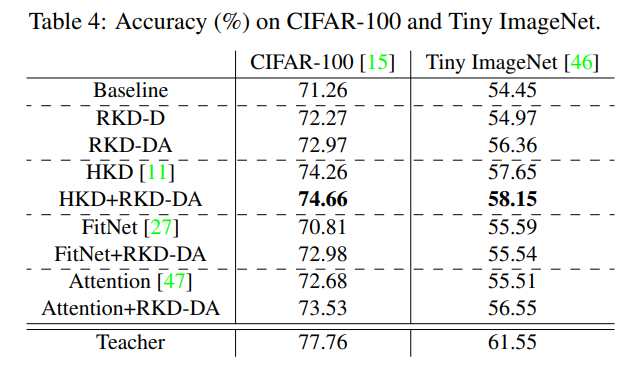 RKD 단독으로 사용했을 때는 오히려 HKD(Hinton's KD)가 더 높았으나, RKD와 다른 기존의 KD를 조합했을때, 모두 성능이 더 향상되었으며, 또한, 가장 높은 성능을 보였다.
