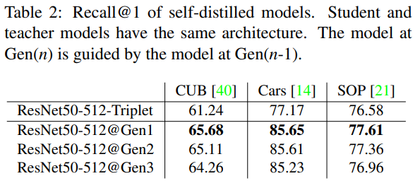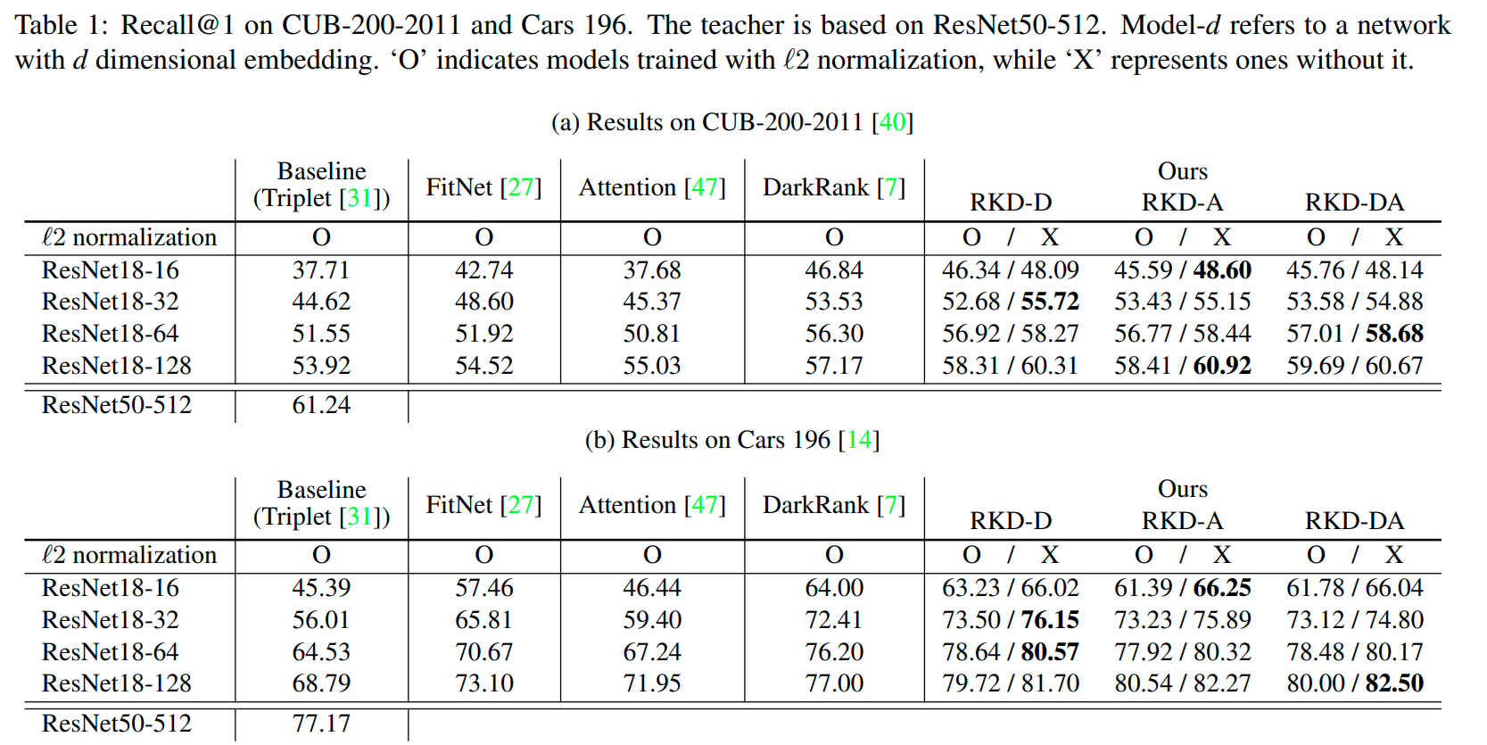 RKD를 사용할 때, 추가적인 task loss(ex triplet loss)는 사용하지 않았다. 즉, teacher model의 embedding 정보를 통해서만 student model은 학습이 되었으며, 기존의 gt label은 student 모델을 학습하는데 사용되지 않았다.